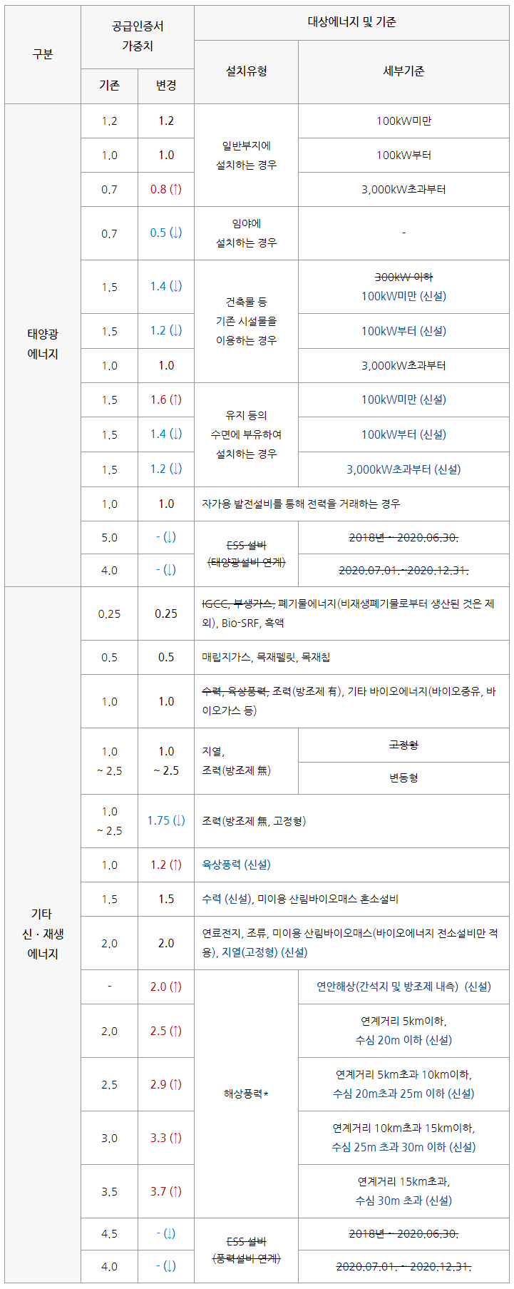 먼저 태양광 설비를 포함한 신재생에너지 설비의 REC 가중치가 전반적으로 조정되었습니다. 연안해상풍력 등 설비에 대한 가중치가 신설된 한편 태양광연계 ESS, 풍력연계 ESS와 같이 가중치 부여기간이 종료된 설비는 가중치가 삭제되었습니다.