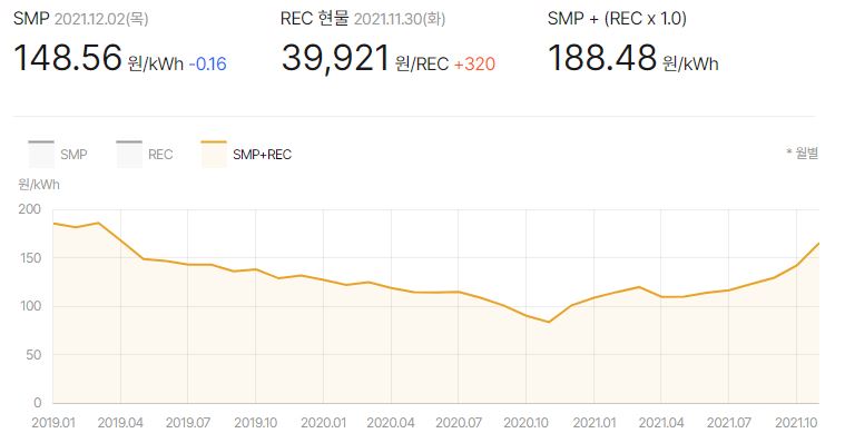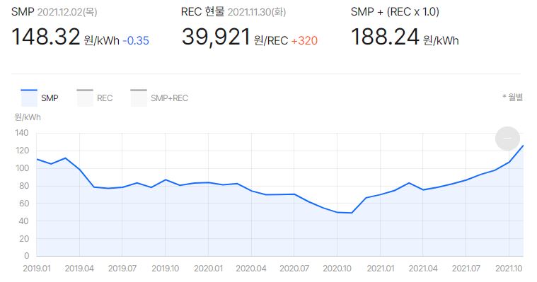 12월 2일을 기준으로 SMP+1REC 가격이 188.48원/kWh에 도달했습니다. 올해 4월부터 꾸준한 상승세를 보인 SMP+1REC 가격은 2019년 3월 이후 처음으로 180원대에 진입했는데요. 육지 SMP와 REC 현물가는 각각 150원과 4만원에 가까운 가격으로 우상향 중입니다.