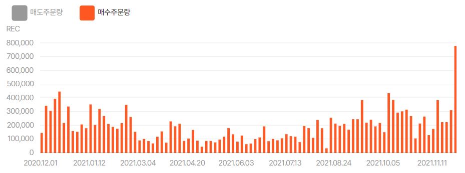 REC 현물 가격은 올해 6월 저점을 찍고 다시 반등했는데요. 지금까지 그 상승세를 유지하고 있습니다. 이러한 추세는 공급의무자의 매수가 눈에 띄게 늘어났기 때문인 것으로 보이는데요. 아래 그래프를 통해 11월 말에 REC 매수주문량이 급증한 것을 확인하실 수 있습니다.