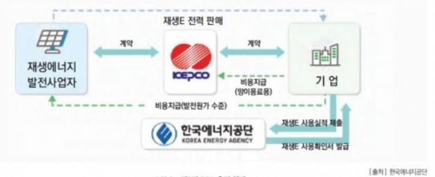 보통 PPA의 계약 주체가 재생에너지 발전소와 RE100 이행 기업이라면 제3자 PPA는 그 중간에 한전이 포함되어 재생에너지 발전소-한전-RE100 이행 기업 이렇게 3자간 계약이 체결됩니다. 이를 통해 재생에너지 발전소는 전력을 한전에 팔고, 한전은 RE100 기업에게 이 전력을 다시 판매하는 것이죠.
