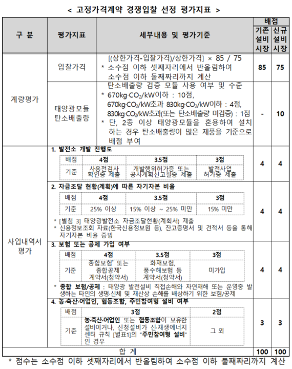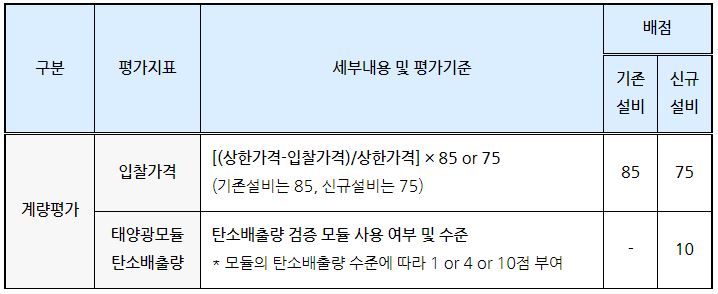 아까 말씀드렸듯 태양광 모듈 탄소검증제가 신규설비 시장에만 적용되면서 두 시장의 계량평가 배점 체계도 달라졌습니다. 계량평가 총점은 85점으로 동일하지만 세부 평가지표에서 배점 차이가 나는것을 확인할 수 있습니다.