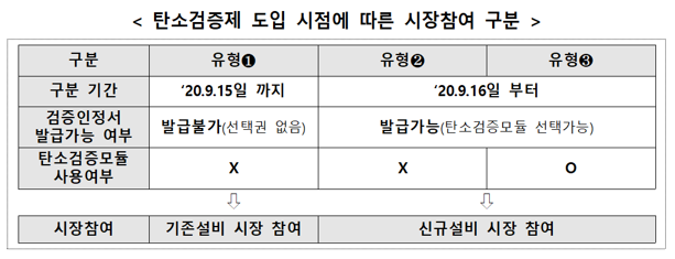 그렇다면 ‘기존설비’와 ‘신규설비’는 어떤 기준으로 구분될까요? 에너지공단에 따르면 탄소배출량 검증인정서 최초 발급시점(’20.9.16)을 기준으로 탄소검증모듈 사용 가부 및 여부에 따라 참여시장이 결정된다고 합니다. 즉 태양광 모듈 탄소검증제 도입시점을 기준으로 시장이 구분되는 것이죠. 예를 들어 탄소배출량 검증인증서 발급전까지 모듈 계약을 체결하여 탄소검증모듈을 사용하지 못한 발전소는 ‘기존설비 시장’에 포함됩니다.