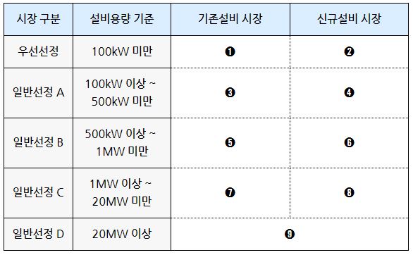 바로 위에서 기존설비와 신규설비 시장도 구분되기 시작했다고 말씀드렸는데요, 이 2개의 시장 각각에 5개씩의 입찰구간이 형성된 것입니다. 단, 일반선정 D(20MW 이상 대규모 시장)의 경우, ‘기존설비 시장’과 ‘신규설비 시장’의 구분 없이 평가가 진행되기 때문에 결론적으로는 아래와 같이 총 10개가 아닌 9개의 구간이 형성됩니다.