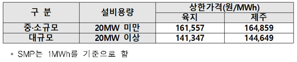 한편, 일반선정 D는 나머지 구간들과 달리 별도의 상한가격을 적용합니다. 다시 말해 상한가격 측면에서 보면 육지 or 제주, 20MW 이상 or 미만 여부에 따라 상한가격이 달라집니다. 2021년 상반기 상한가격(SMP+1REC 가격)은 아래와 같습니다.